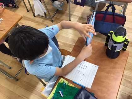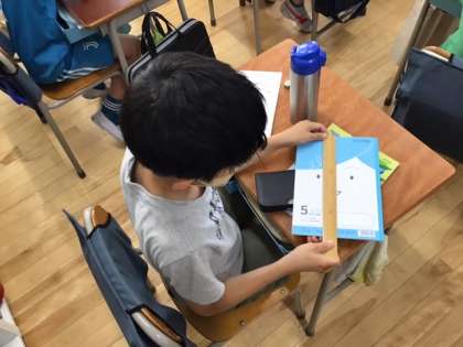 算数の時間です。「長さ」ノートのたてや水筒の周りの長さを予想して、実際にはかってみます。