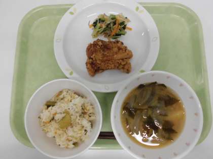 献立 野沢菜ご飯、鶏肉のさんぞく焼き、きのこ入りお浸し、じゃが芋のみそ汁、牛乳