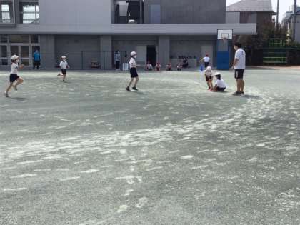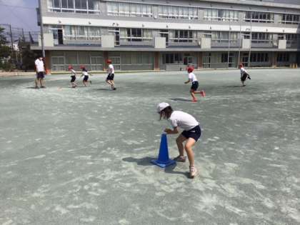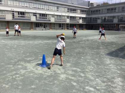 体育の時間です。紅白対抗「バックホームゲーム」に取り組んでいます。
