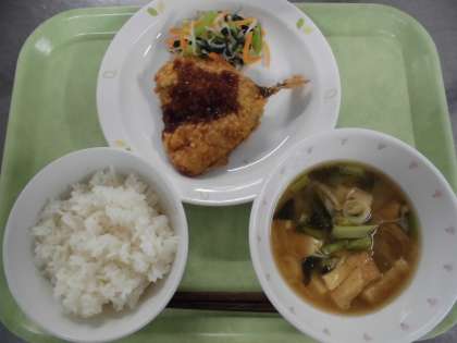 献立 ご飯、あじフライ、塩和え、えのきのみそ汁、牛乳