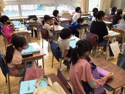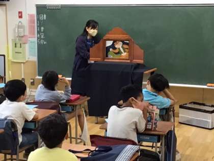 図書の時間です。司書の先生の読み聞かせです。子どもたちは本当に読み聞かせが大好きです。