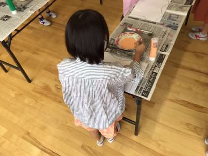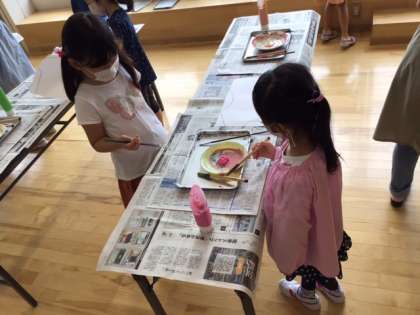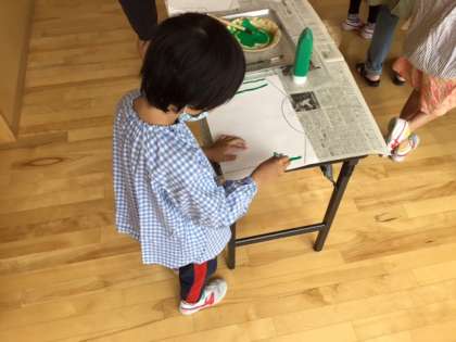 図工の時間です。「えのぐで せんをかこう」いろいろな色を使って、マイシャツをデザインします。