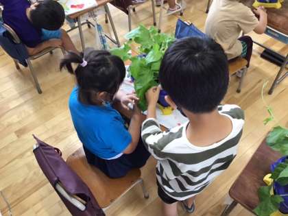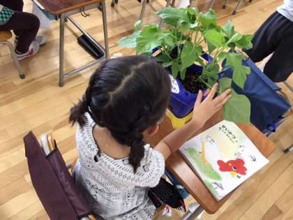 生活科の時間です。「さかせたいな わたしのはな」葉の増えた様子を絵と言葉でカードに書いていきます。