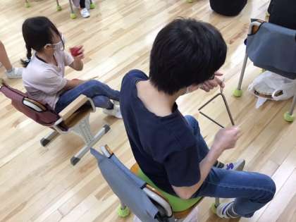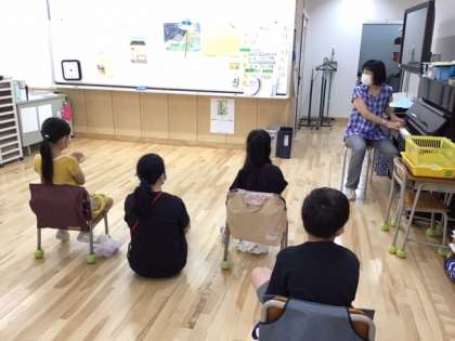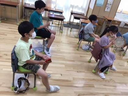 音楽の時間です。「かめの えんそく」を歌と合奏で表現しています。