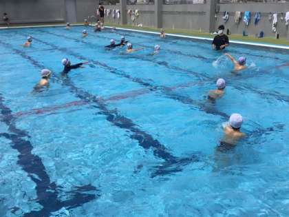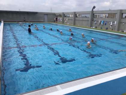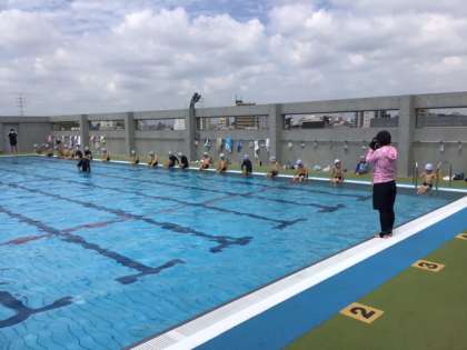 水泳の時間です。2年ぶりの水泳指導です。今年は、感染予防を徹底するため、クラスごとでプールに入ります。