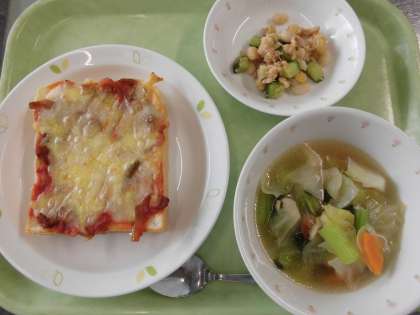 献立 ピザトースト、野菜スープ、ビーンズサラダ、牛乳