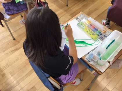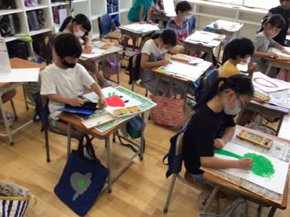 図工の時間です。「大きくそだて びっくりやさい」自分だけの秘密を考えて、絵に表していきます。