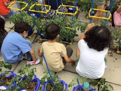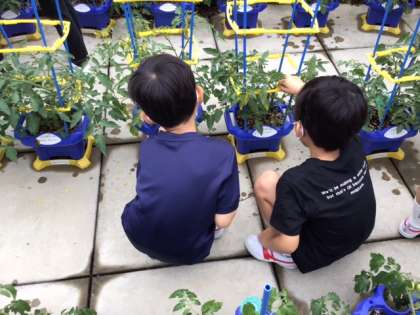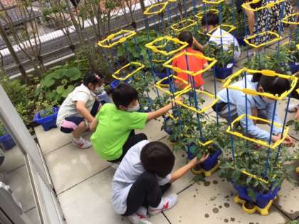 生活科の時間です。プチトマトが育ってきました。早く赤くならないかな。