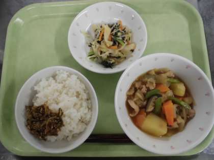 献立 ご飯、ピーマンふりかけ、肉じゃが、ひじきサラダ、牛乳