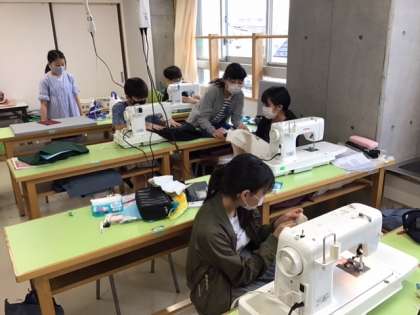 家庭科の時間です。ポケットを縫いつけたり、飾りをつけたりして、自分だけのマイバッグを作ります。