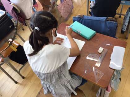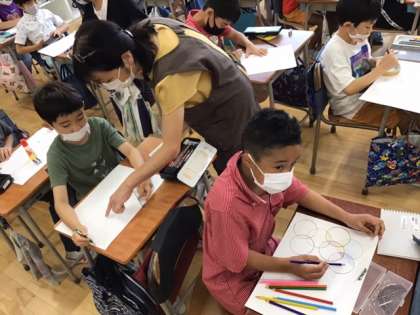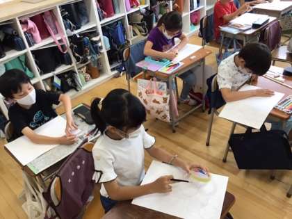 図工の時間です。「線と線が集まって」いろいろな線を組み合わせたり、色の塗り方を工夫したりして、形を楽しみます。