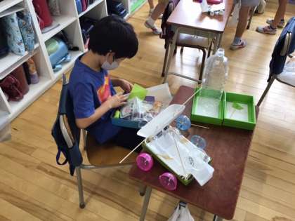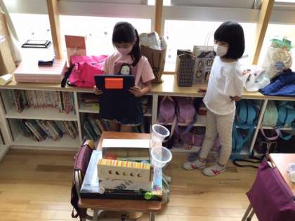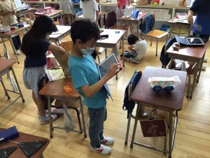 生活科の時間です。「動くおもちゃ」作ったおもちゃでたくさん遊んだあとは、iPadで写真に撮って発表会をします。