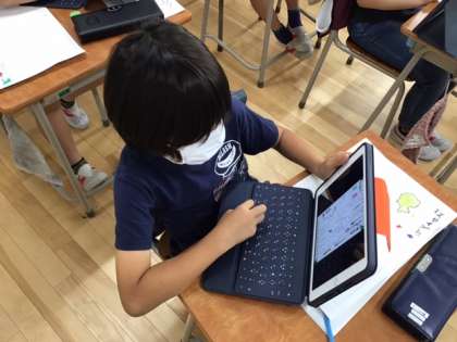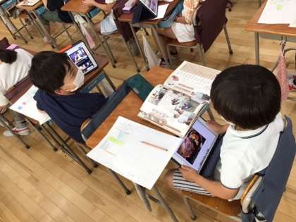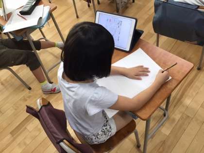総合的な学習の時間です。先生が作成した見本の作品を、iPadで共有して学習に生かしています。