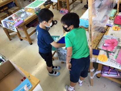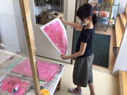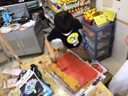 図工の時間です。モノタイプ版画で、きれいな模様の紙を3枚作っています。
