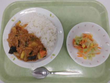献立 夏野菜カレーライス、コールスローサラダ、牛乳