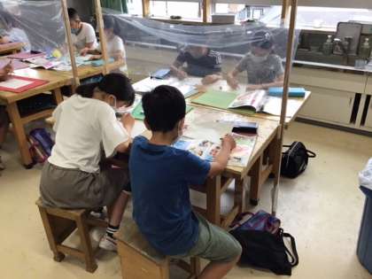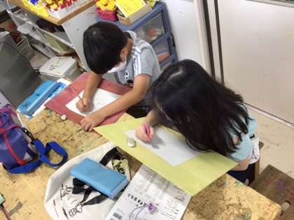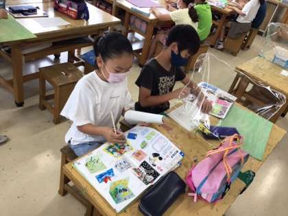 図工の時間です。「ほって 表す 不思議な花」アイデアスケッチに取り組んでいます。