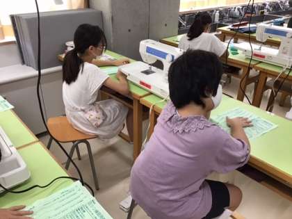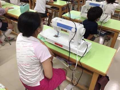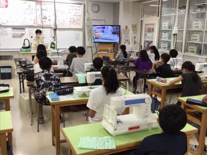家庭科の時間です。ミシンの約束を一つ一つ確認しています。