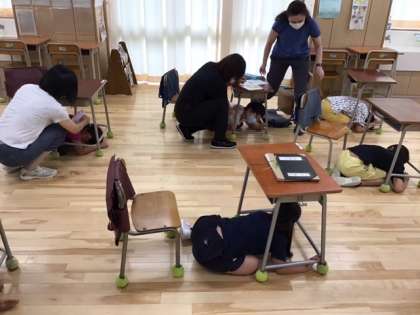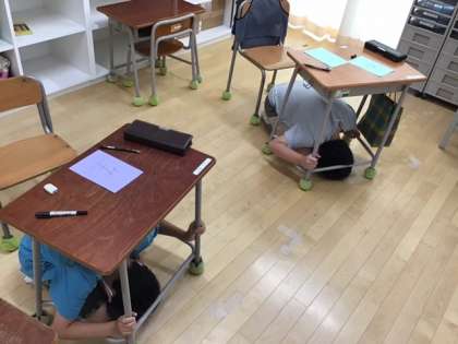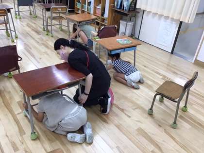 今日の避難訓練は、地震を想定して実施しました。身を守る姿勢をしっかりととっています。
