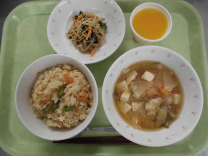 献立 子ぎつねご飯、野菜のごまだれかけ、豚汁、キャロットゼリー、牛乳
