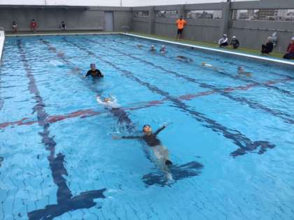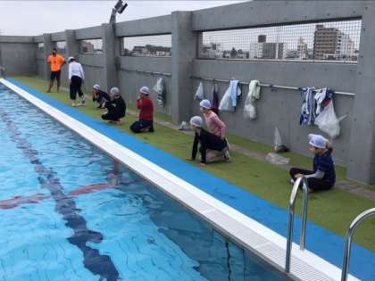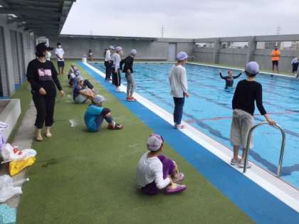 体育の時間です。着衣泳に取り組んでいます。とても大切な経験ですね。