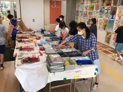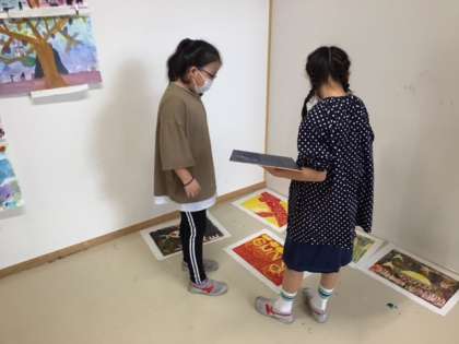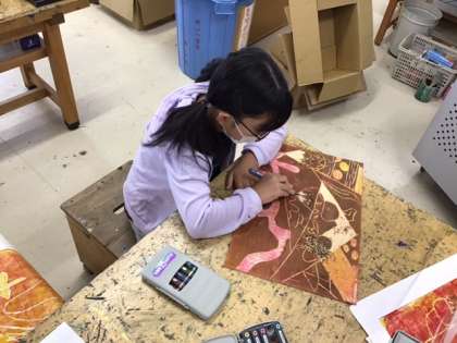 図工の時間です。「彫り進み木版画」作品の完成が近づいてきました。