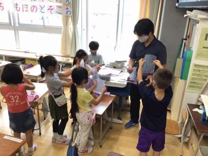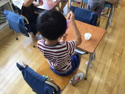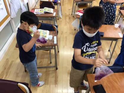 生活科の時間です。落ちたあさがおの花を使って、色水づくりをしています。