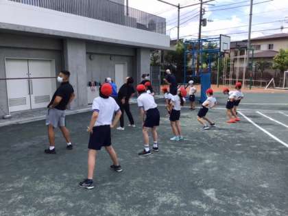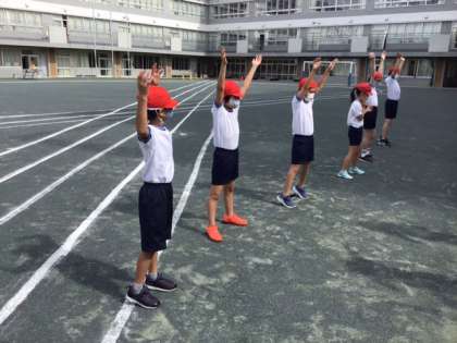 体育の時間です。とても気持ちの良い気候です。元気にラジオ体操をしています。
