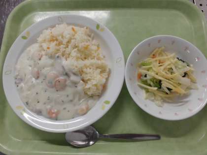 献立 えびクリームライス、パリパリポテトのサラダ、牛乳