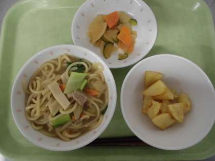献立 長崎ちゃんぽん、中華風大根サラダ、スパイシーポテト、牛乳