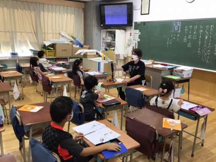 国語の時間です。「間」の練習をしています。言葉集めでは、たくさん意見が出ています。