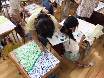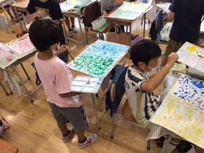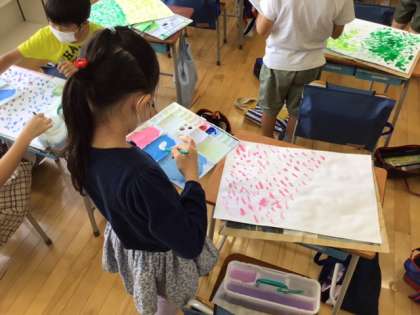 図工の時間です。「色いっぱいの ふしぎな花の世界」まずは、画用紙いっぱいに色つけをしています。
