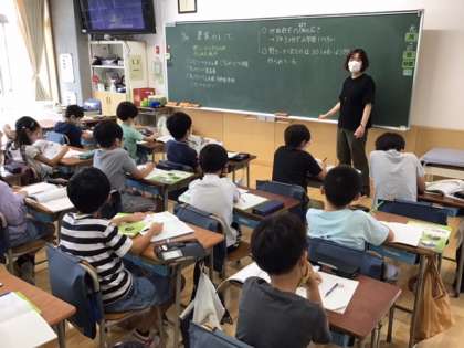 社会科の時間です。「農家のしごと」これからの学習で、どんなことを知りたいかを考えています。