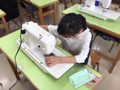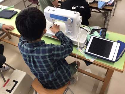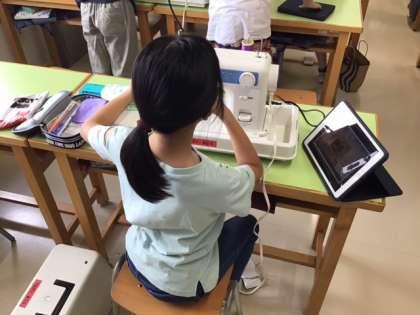 家庭科の時間です。ミシンに取り組んでいます。確かめたいところは、iPadに配信された映像を活用しています。