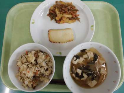 献立 昆布ご飯、いかのしょうが焼き、じゃが芋のきんぴら、えのきのみそ汁、牛乳