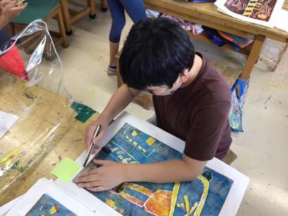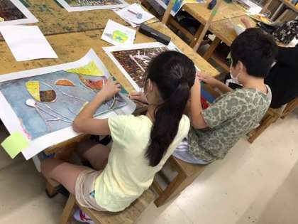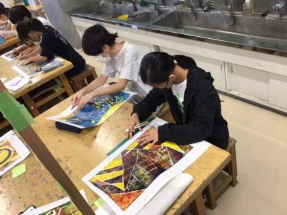 図工の時間です。何枚か仕上げた作品の中から、代表作を選んでいます。