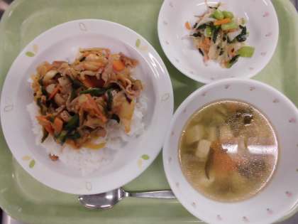 献立 豚キムチ丼、えだまめサラダ、わかめスープ、牛乳
