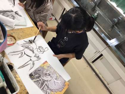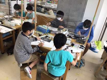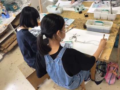 図工の時間です。「墨で龍を描こう」「にじみ」「ぼかし」「濃淡」を意識して、思い切って龍を描きます。