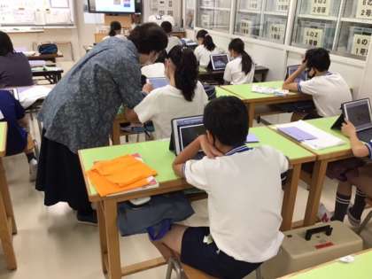 家庭科の時間です。ミシンの使い方について、動画で確認しています。繰り返し確認することができ、理解が深まりますね。