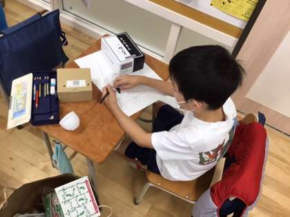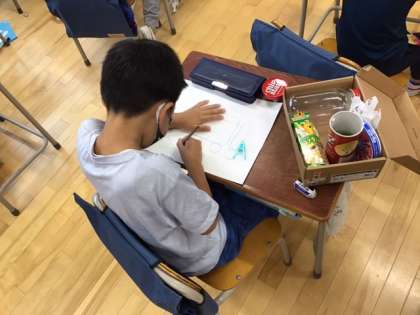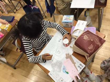 算数の時間です。いろいろな形を画用紙に写しとり、はさみで切りとっていきます。切りとった形で何ができるかな?