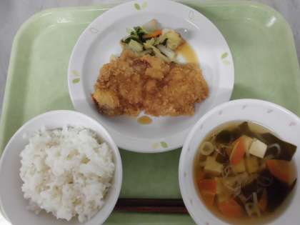 献立 ご飯、たれかつ、白菜のお浸し、紅白すまし汁、牛乳