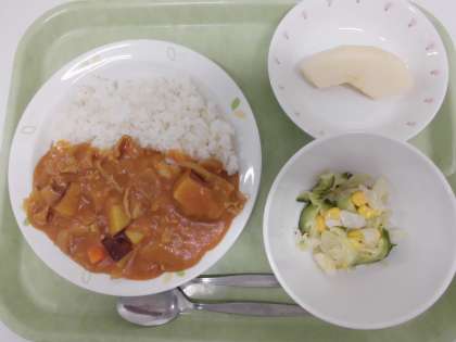 献立 秋のカレーライス、コーン入りフレンチサラダ、りんご、牛乳