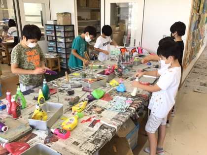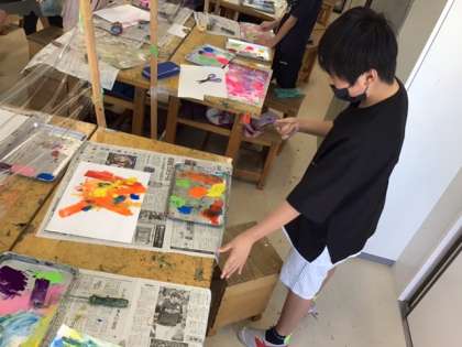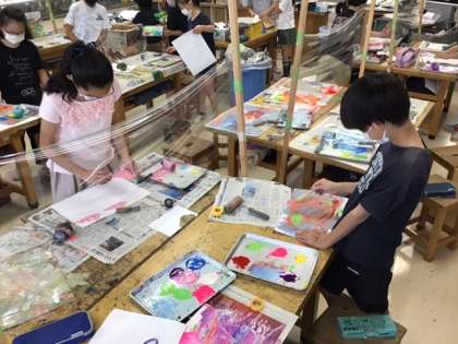 図工の時間です。「進め! ローラー大作戦」ローラーの特徴を生かして、表し方を工夫しています。