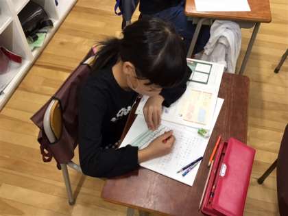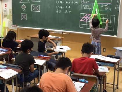 算数の時間です。形も大きさも同じ平行四辺形の書き方を考えています。