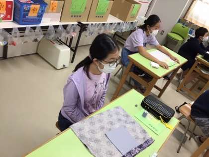 家庭科の時間です。マイバッグづくりに取り組んでいます。今日は、三つ折出し入れ口を縫います。
