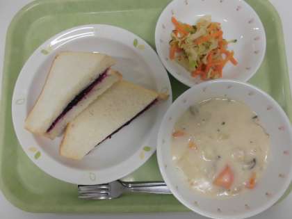 献立 ブルーベリージャムサンド、白いんげん豆のクリームシチュー、にんじんサラダ、牛乳