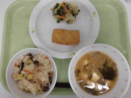 献立 秋の香りご飯、いかの竜田揚げ、野菜のごま和え、豆腐とわかめのみそ汁、牛乳