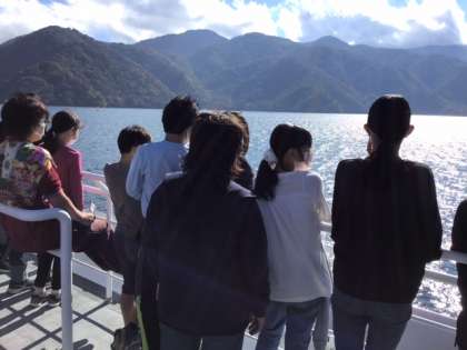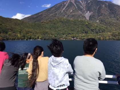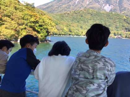 中禅寺湖の遊覧船に乗船しています。船からの紅葉がとてもきれいです。