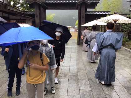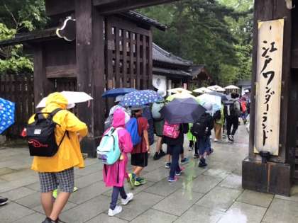 日光江戸村に到着しました。お侍さんの出迎えを受け、期待が高まりますね。