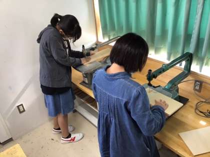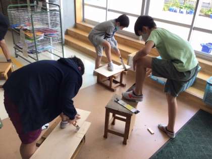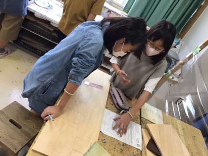 図工の時間です。「わたしはデザイナー」いよいよ一枚の板を切り出しました。どんな作品が出来上がるのか、楽しみですね。