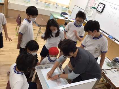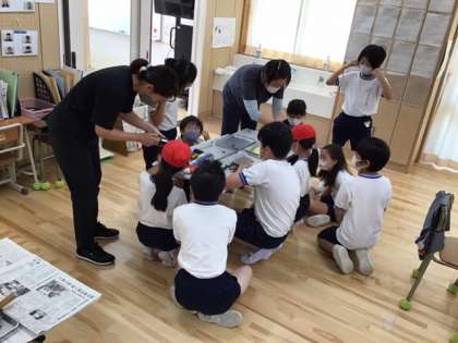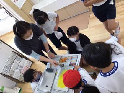 図工の時間です。「くるみ水族館」今日は、印刷に挑戦します。先生の説明をしっかり聞いてから始めます。